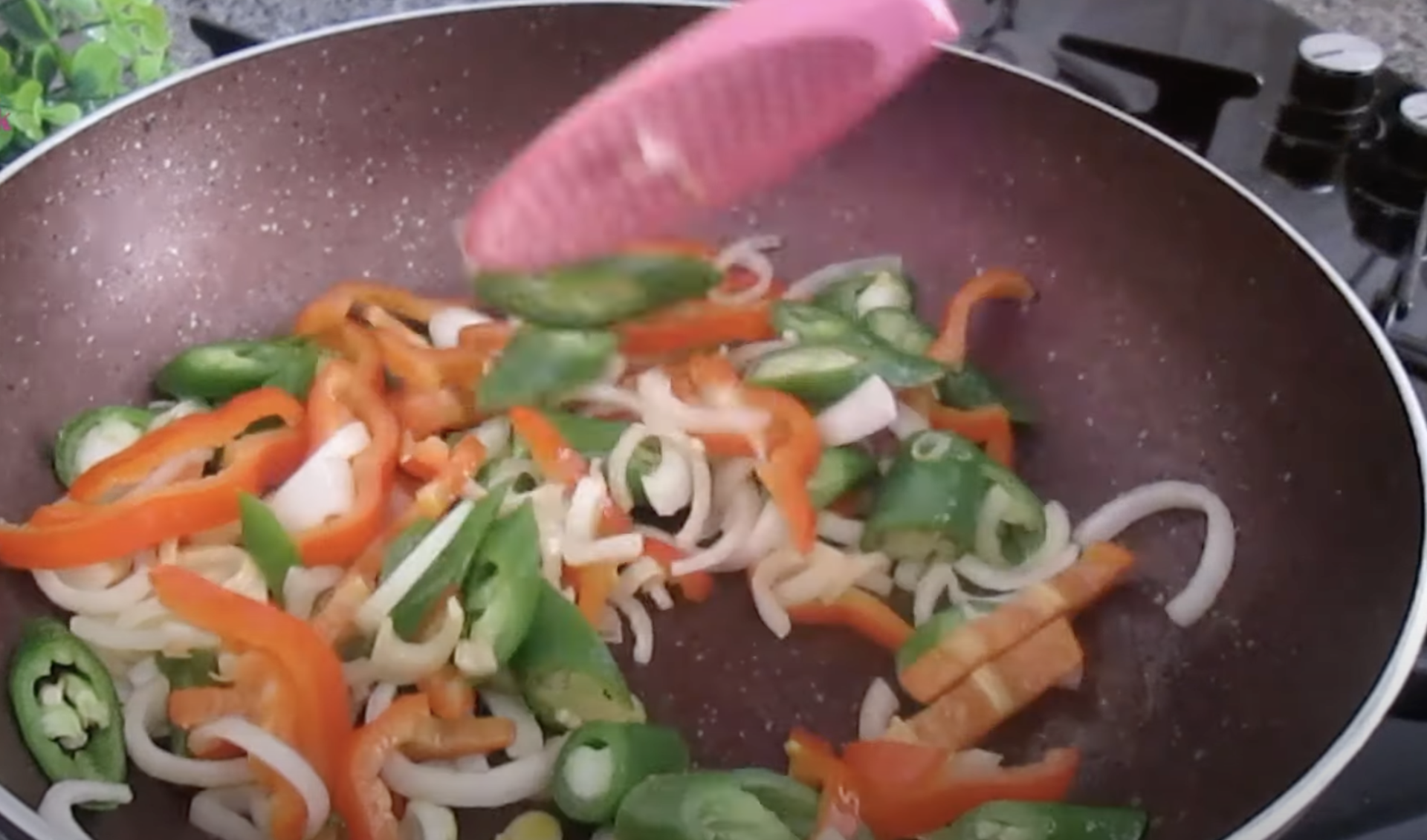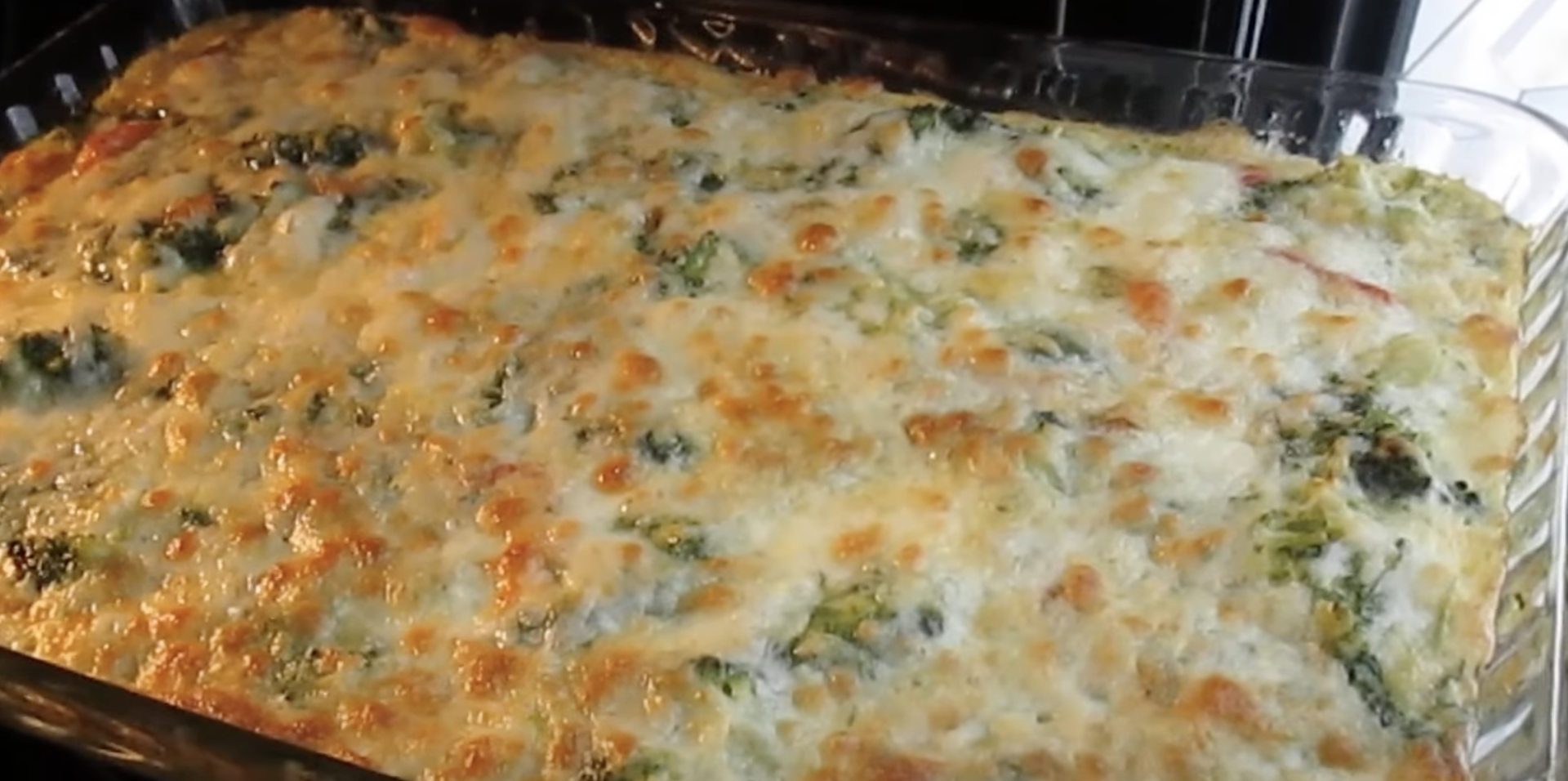 Odcedź warzywa. Oczyść i pokrój cebulę i paprykę. Podsmaż je na odrobinie oleju. Teraz w wysmarowanym tłuszczem naczyniu do pieczenia ułóż brokuły oraz cebulę z papryką.