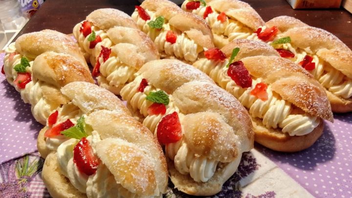 Wyjmij warkocze z piekarnika i pozostaw je do całkowitego ostygnięcia. W międzyczasie przełóż krem ​​waniliowy do rękawa cukierniczego. Warkocze odetnij i wypełnij kremem waniliowym. Następnie udekoruj je dowolnymi świeżymi owocami, miętą lub melisą. Na koniec posyp je cukrem pudrem.