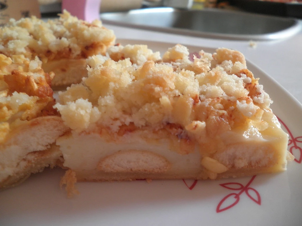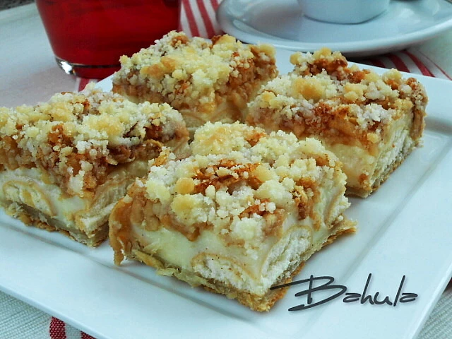 Rozwałkuj ciasto francuskie na blasze do pieczenia. Ułóż biszkopty płaską stroną do dołu. W międzyczasie ugotować krem, dosłodzić i wylać na biszkopt z ciasta francuskiego. Jabłka obrać i zetrzeć na grubej tarce. Wyciskamy z nich sok i rozprowadzamy na cieście. Możemy posypać je orzechami włoskimi.
