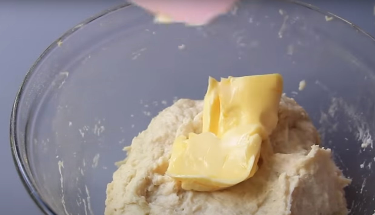 Do miski wlej ciepłe mleko, dodaj drożdże, cukier i wymieszaj. Odczekaj 5 minut, a następnie dodaj mąkę i sól. Wymieszaj, dodaj masło i wyrób zbite ciasto (ugniataj około 2 minuty).