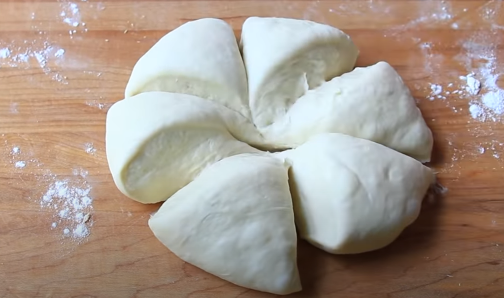 Przykry i pozostaw do wyrośnięcia na około 60 – 90 minut. Blat i ciasto oprósz odrobiną mąki. Ciasto ukształtuj w okrąg i podziel na 6 równych trójkątów.