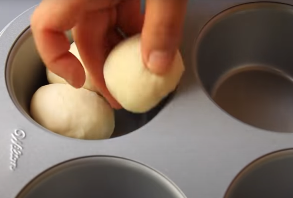 Zroluj, przykryj bawełnianą szmatką i odstaw na kolejne 15 minut. Następnie delikatnie spłaszcz każdy kawałek, przekrój na trzy mniej więcej równe części, uformuj z każdego kulkę i umieść po 3 kulki w jednym otworze na babeczkę.