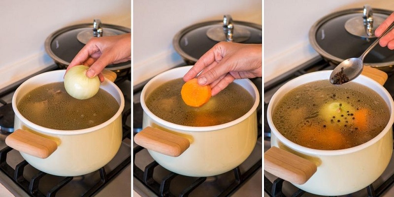 Zestaw przypraw może różnić się w zależności od preferencji smakowych i podstawy bulionu. Kurczaka można zamienić na kilogram lub półtorej kości wołowej na 4 litry. Nie należy pomijać octu oraz przybliżonych proporcji ( w tym przypadku składniki bulionu z kurczaka wystarczą na 3 litry).
