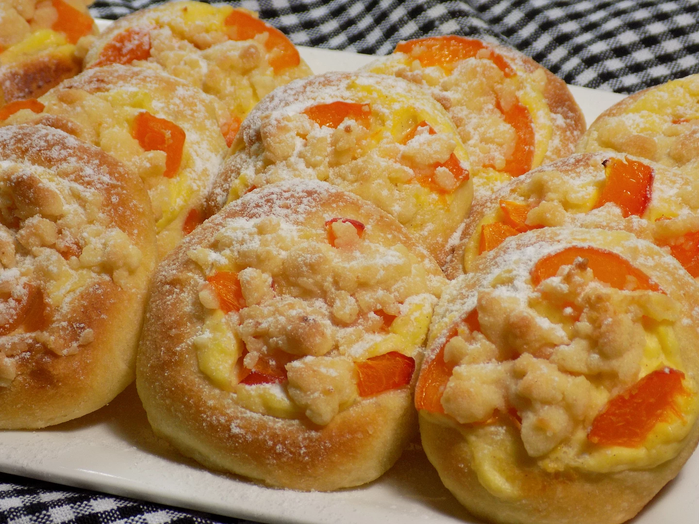 Umieść nadzienie twarogowe w zagłębieniach łyżką. Ułożyć na nim kawałki moreli. Na koniec kładziemy okruchy na ciastach. Pieczemy je w nagrzanym piekarniku do 180°C, aż brzegi ciastek zaczną się złocić. Pozwól ciastkom ostygnąć i posyp cukrem.