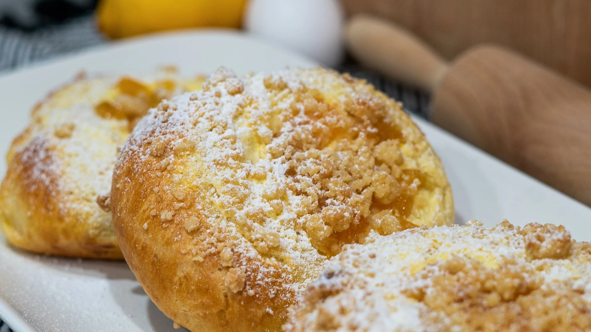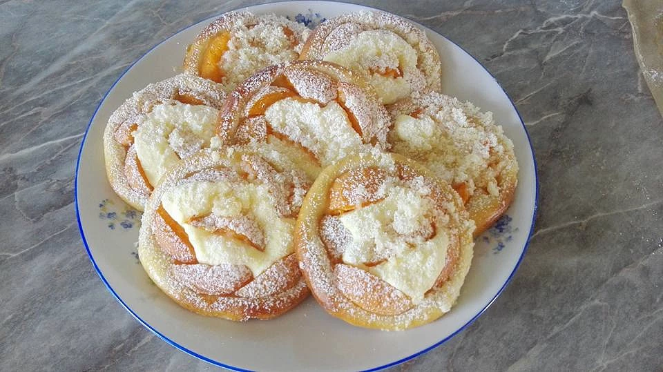 Przygotować twaróg, do którego ucieramy żółtka, oba cukry i skórkę z cytryny. Białka ubić na sztywną pianę i wymieszać z twarogiem. Z mąki, cukru i masła zrobić kruszonkę. Morele wydrylować i pokroić na kawałki. Z ciasta formować małe kulki, układać na blasze do pieczenia i odstawić na 10-15 minut do wyrośnięcia. Każdą dociskamy dnem szklanki (którą zanurzamy w mące), aby zrobić dołek na nadzienie i smarujemy roztrzepanym jajkiem.