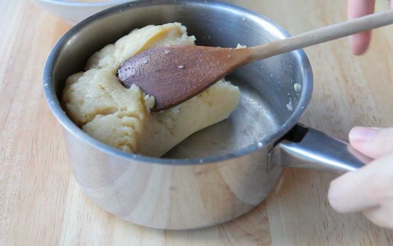 Do niedużego garnka, na średnim ogniu, wlej wodę, dodaj masło i zagotuj. Następnie wsyp przesianą przez sito mąkę. Mieszaj powoli, aż do uzyskania gładkiej masy. Wyrobione ciasto zdejmij z ognia i dodawaj kolejno jajka, nieustannie mieszając, by składniki się połączyły.
