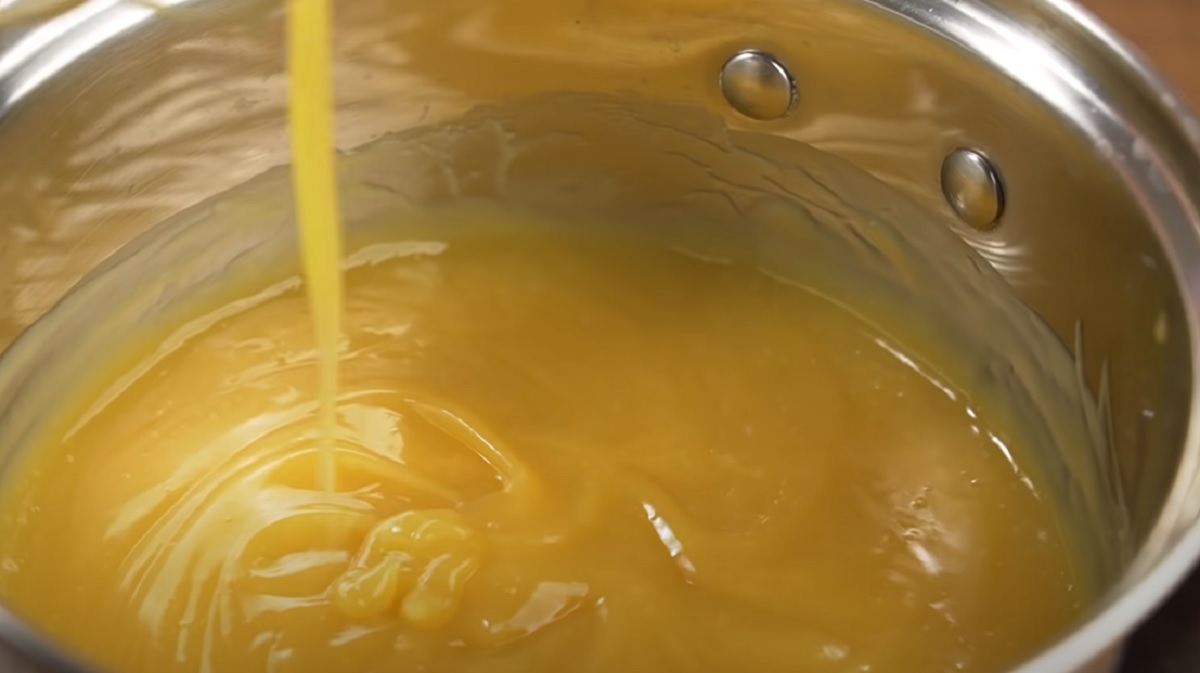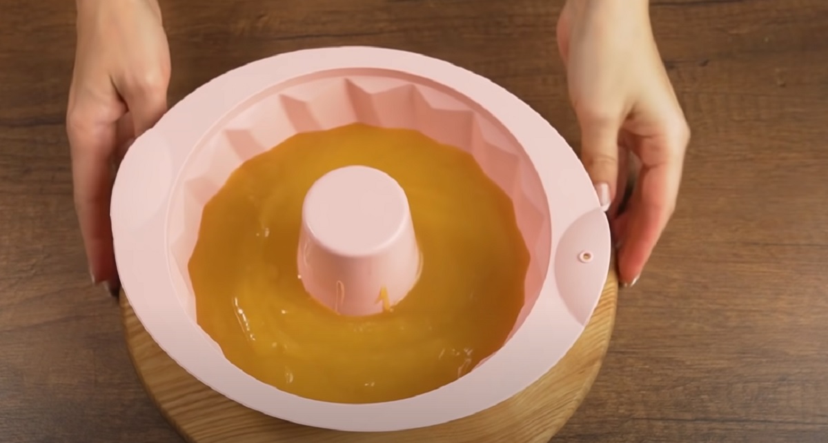 Po zagotowaniu poczekaj do zgęstnienia masy. Przygotuj silikonową formę o średnicy 24 cm i pozostaw w niej warstwę pomarańczową do osiągnięcia temperatury pokojowej.