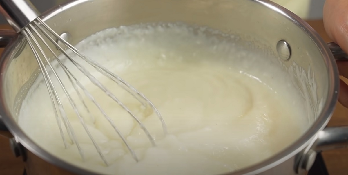 W garnku wymieszaj mleko, pozostały cukier, kaszę mannę, cukier waniliowy oraz wiórki kokosowe. Mieszaj do zagotowania i zgęstnienia.