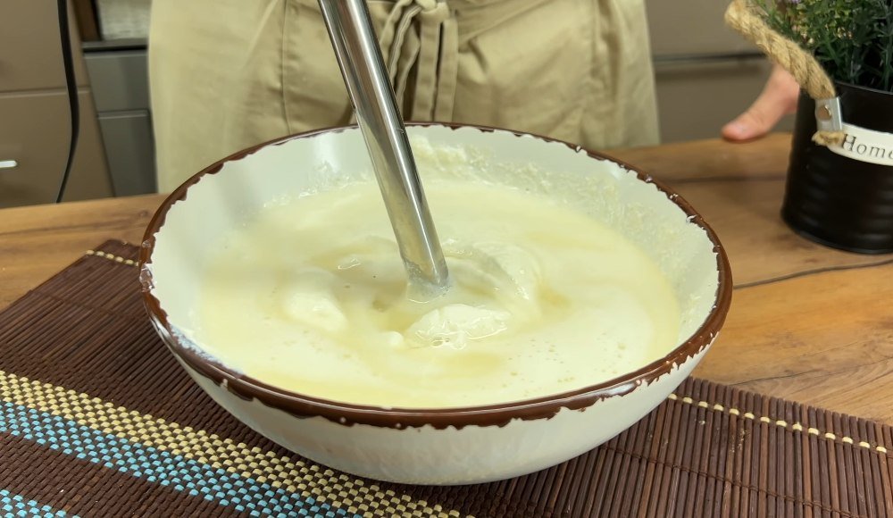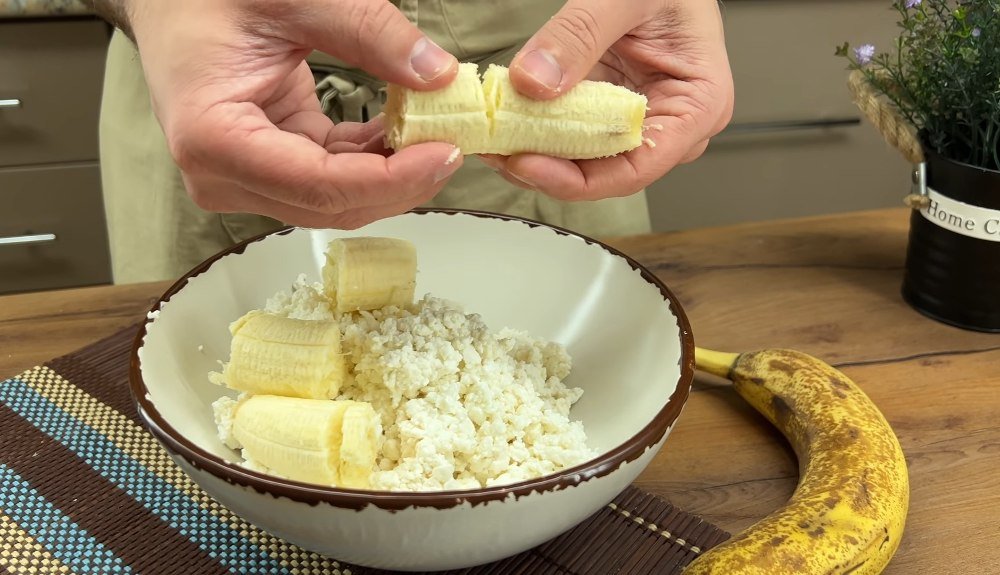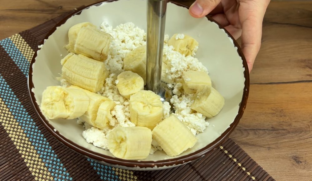 Następnie obierz banany i połącz je z twarogiem – dokładnie zmiksuj te dwa składniki razem, na przykład za pomocą kuchennego blendera.