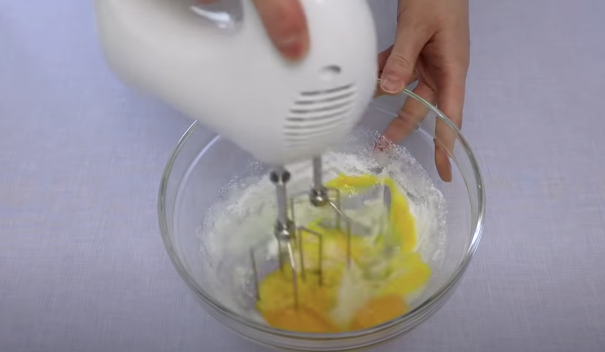 W misce ubijamy jajka z cukrem i cukrem wanilinowym. Kolejno dodajemy przesianą mąkę i proszek do pieczenia. Wszystko miksujemy na małych obrotach.
