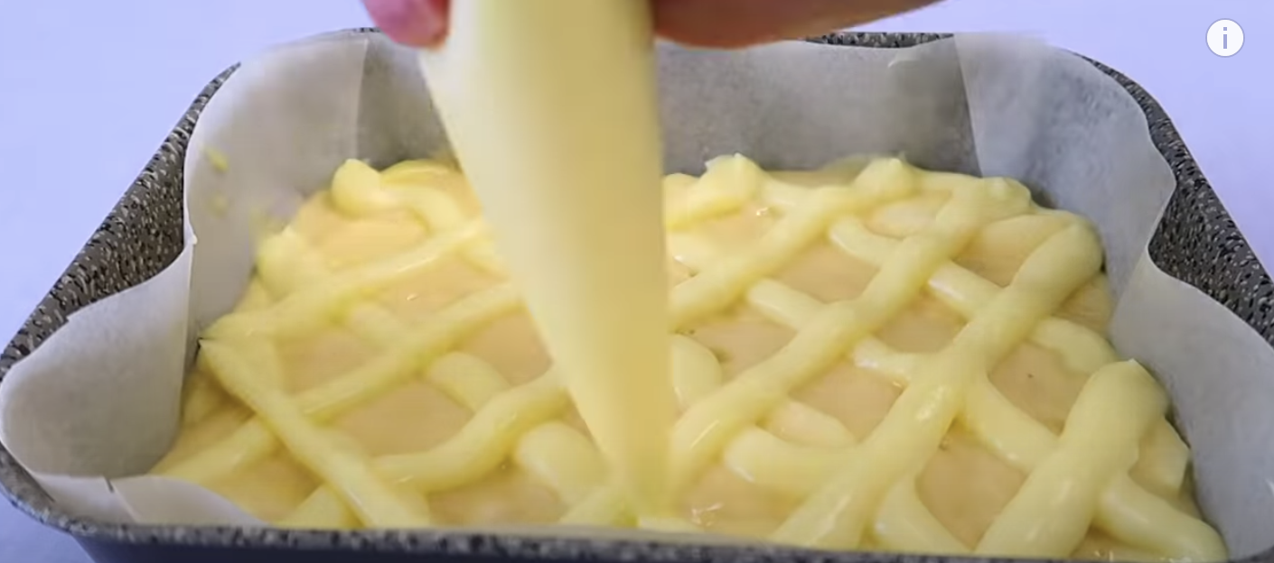 Ciasto wlewamy do formy. Krem przekładamy do szprycy cukierniczek i tworzymy na wierzchu ciasta kratkę.