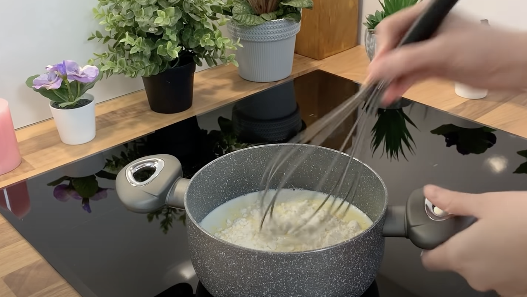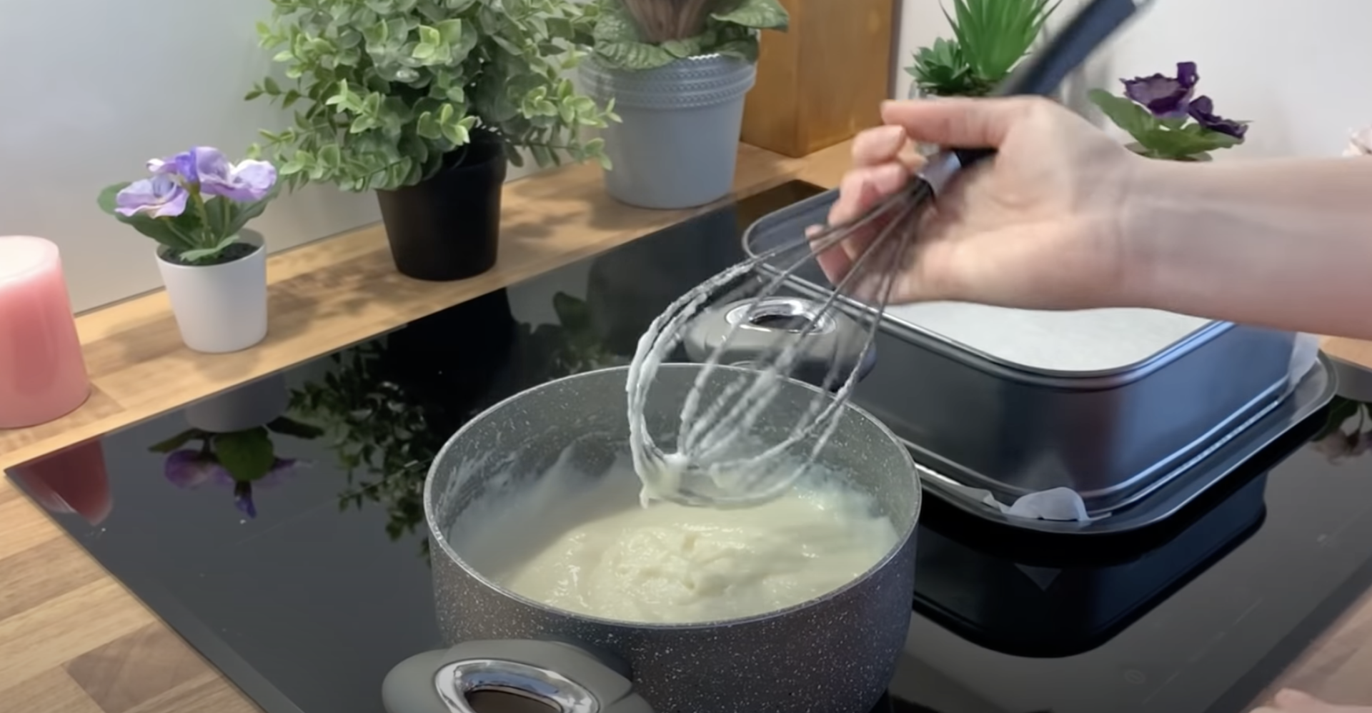 Następnie wymieszać cukier z budyniem oraz mlekiem i zagotować do uzyskania jednolitej masy budyniowej.