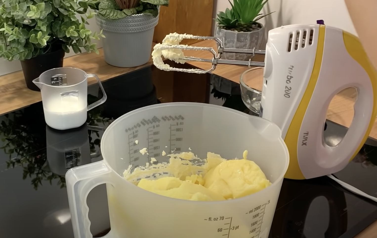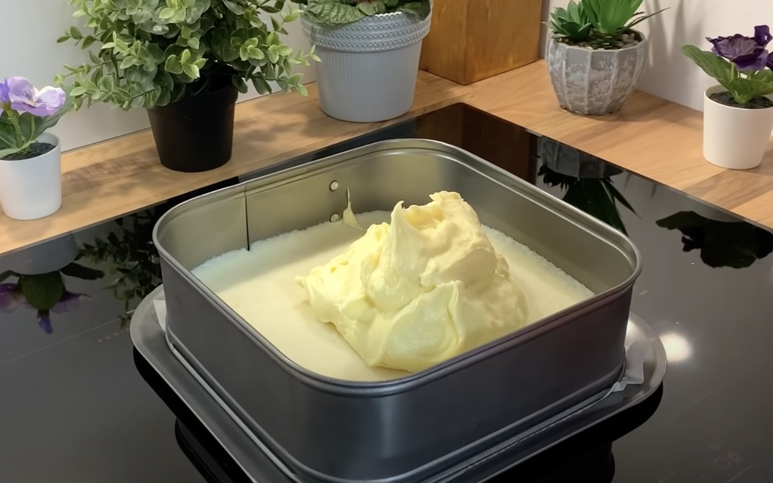 Powoli dodawać schłodzoną masę budyniową oraz 250 ml śmietanki kremówki, cały czas ubijając. Krem przełożyć do formy jako drugą warstwę.