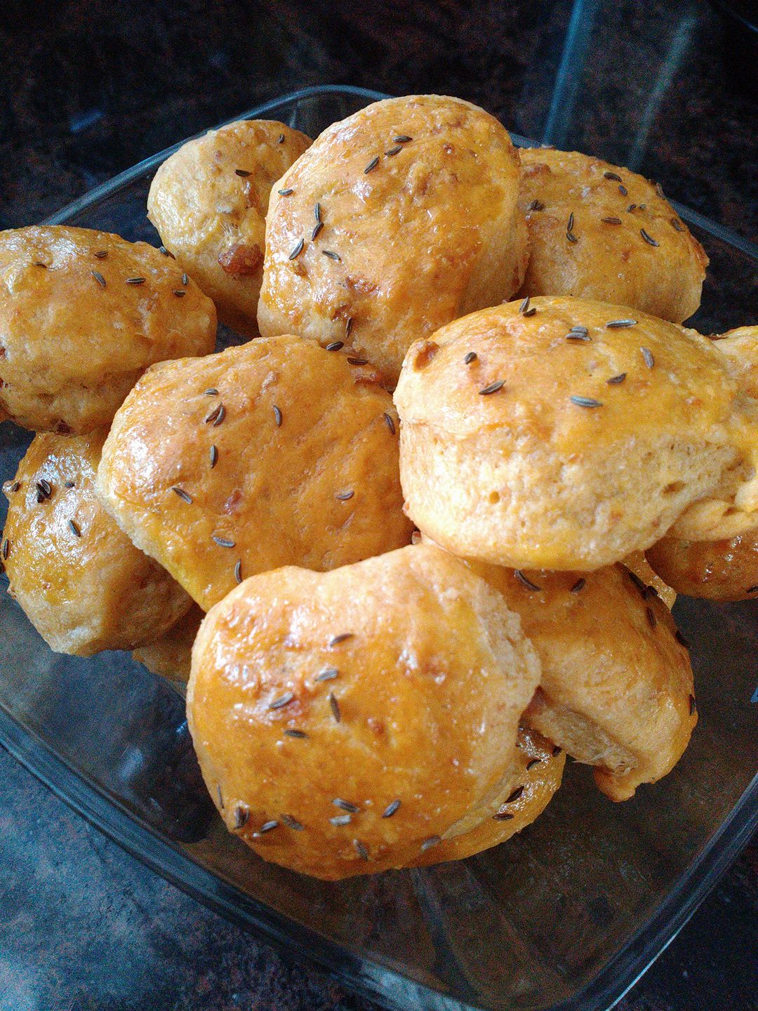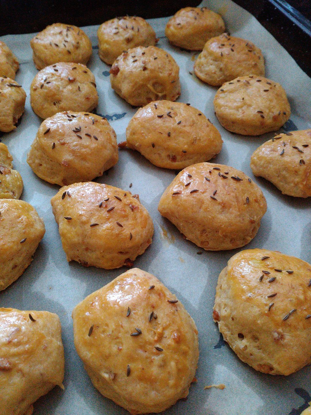 Posmaruj je roztrzepanym jajkiem i posyp nasionami, kminkiem lub z solą. Piec w nagrzanym piekarniku w temperaturze 200°C przez około 10 minut, aż będą pięknie złociste.