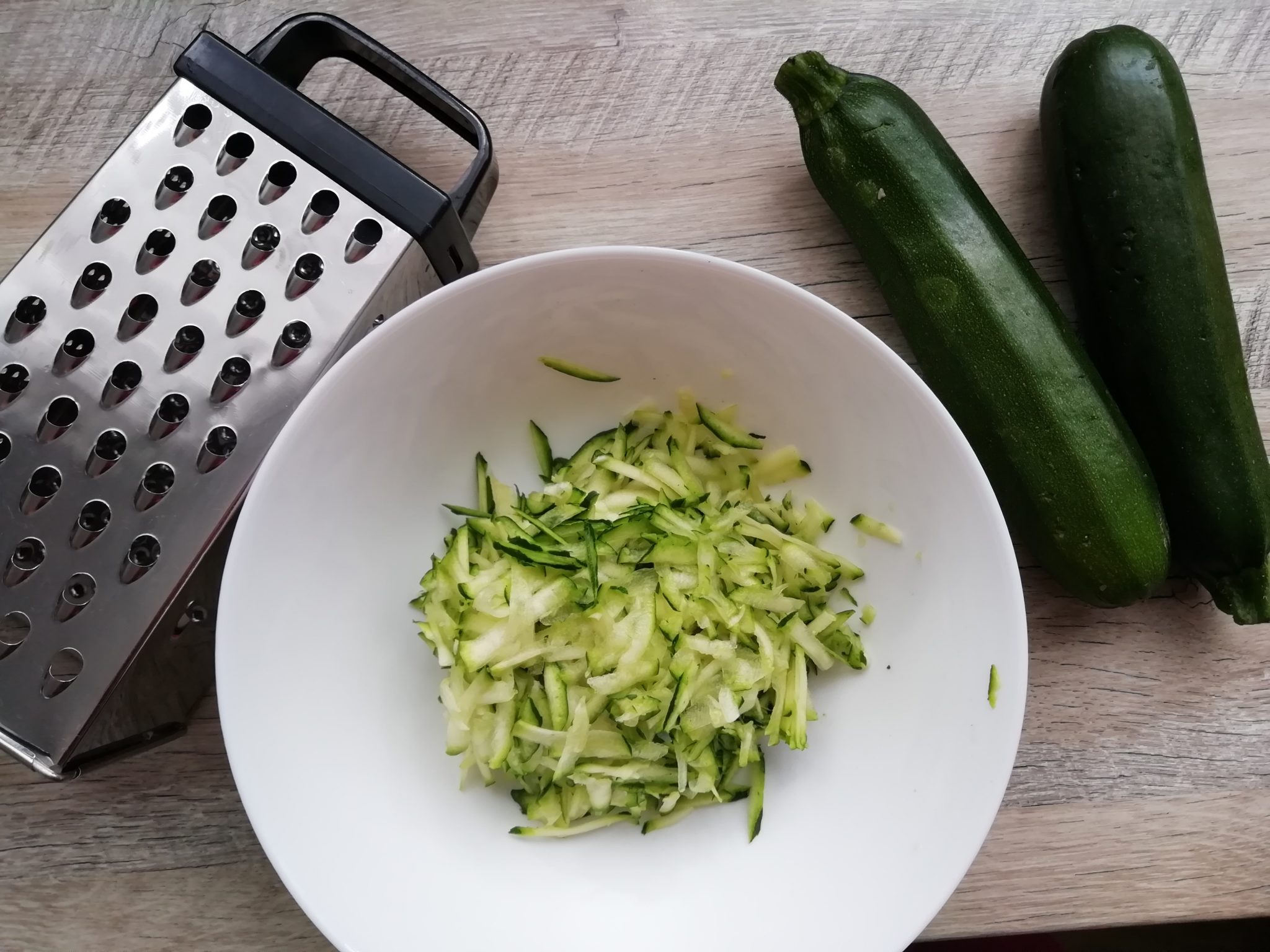 Cukinię umyć, zetrzeć na drobnej tarce (można obrać, ale nie jest to konieczne). Posól i pozostaw.