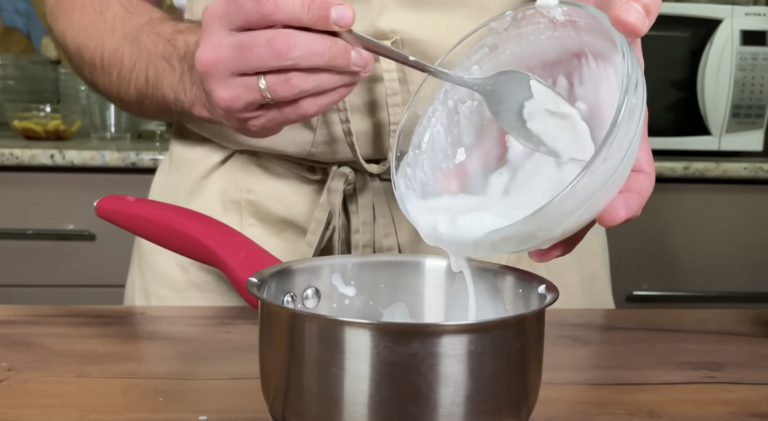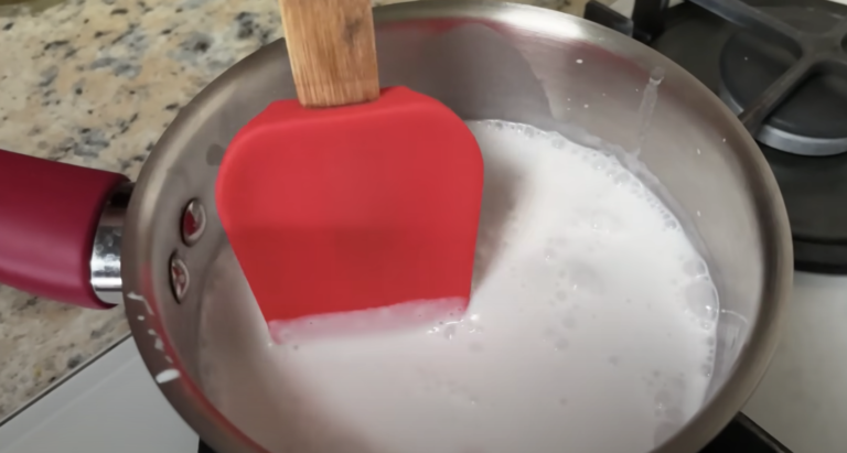 Wymieszać z podgrzanym mlekiem i rozpuścić mieszając.