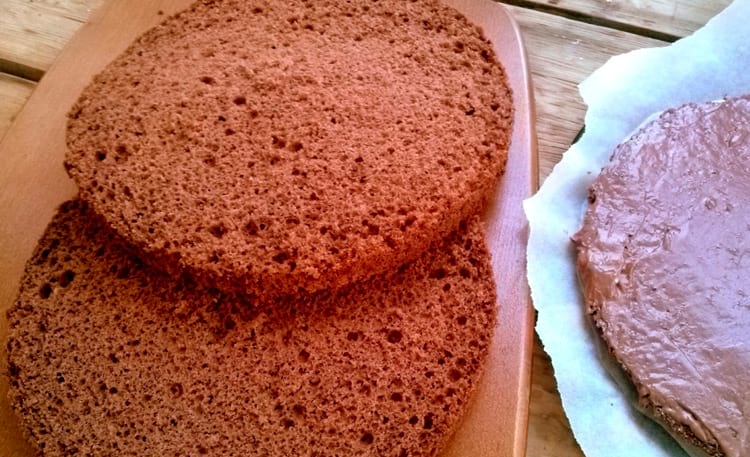 Ostrożnie wyjmij schłodzone ciasto z formy i długim nożem lub nitką pokrój je na trzy talerze mniej więcej równej wysokości. Umieść spód na tacy do serwowania, rozsmaruj obfitą warstwę kremowego nadzienia i wygładź powierzchnię.