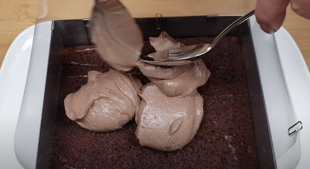 Na pierwszy biszkopt wyłóż ⅓ kremu, przykryj ją kolejną warstwą ciasta i lekko dociśnij. Na to rozprowadź kolejną porcję kremu, następnie biszkopt, po czym powtórz czynność. Włóż ciasto do lodówki.