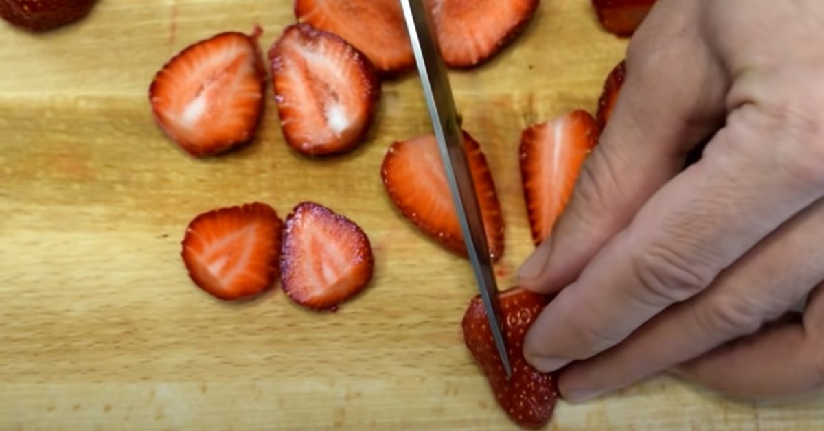 Umyj truskawki, usuń szypułki i przekrój na pół.