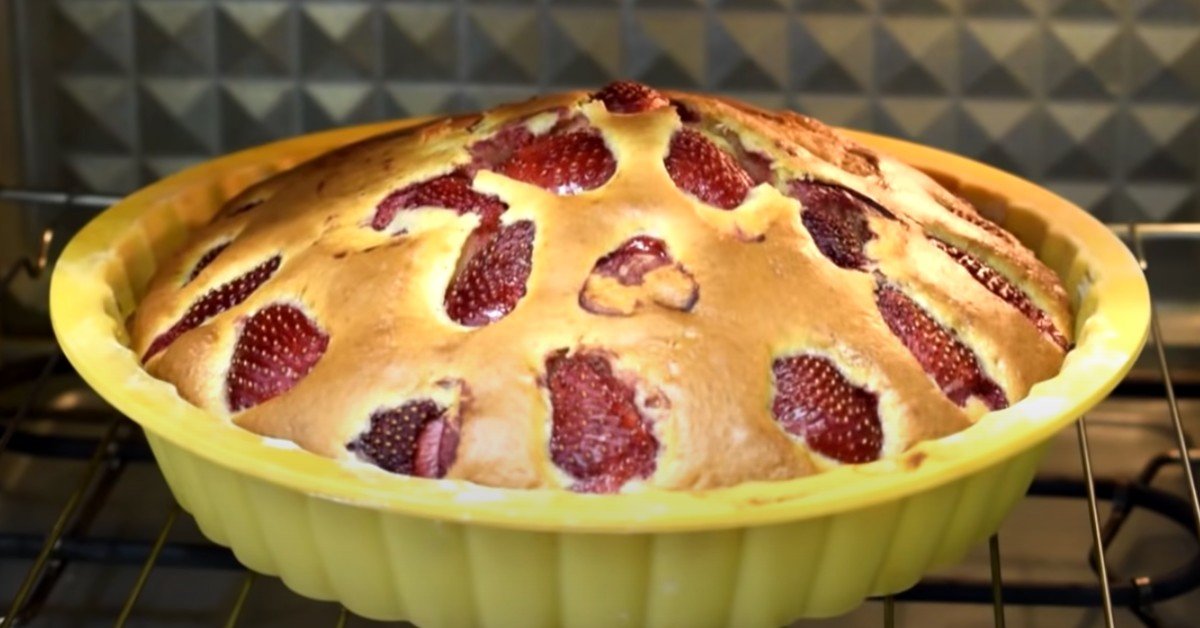 Posmaruj naczynie do pieczenia masłem i posyp mąką. Wlej ciasto do foremki. Ułóż truskawki na wierzchu.