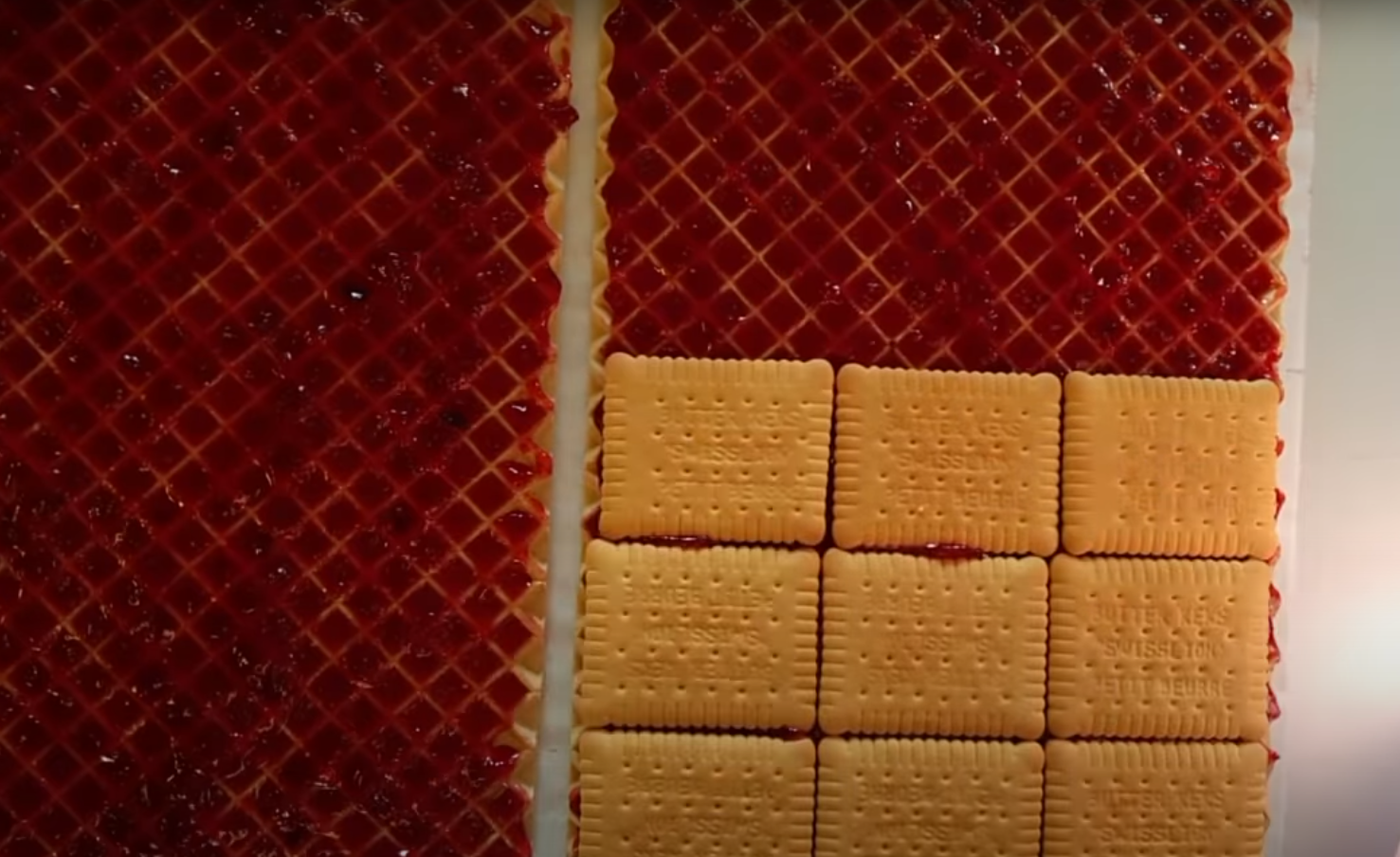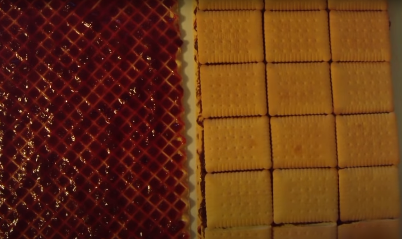 Gdy całość stężeje na wafle które zostały wyłożone masą należy ułożyć warstwę z drugiego wafla, dżemu oraz herbatników. Ciasto już jest prawie gotowe. Aby stężało warto położyć na nie coś ciężkiego i wstawić na kilka godzin do lodówki.