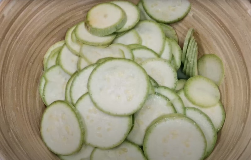 Młodą cukinię umyj i pokrój w plastry, najcieńsze jakie potrafisz. Jeżeli cukinia jest duża, przekrój ją na pół i dopiero krój w plastry. Umieść przygotowaną cukinię w głębokiej misce i posyp jedną łyżeczką soli.