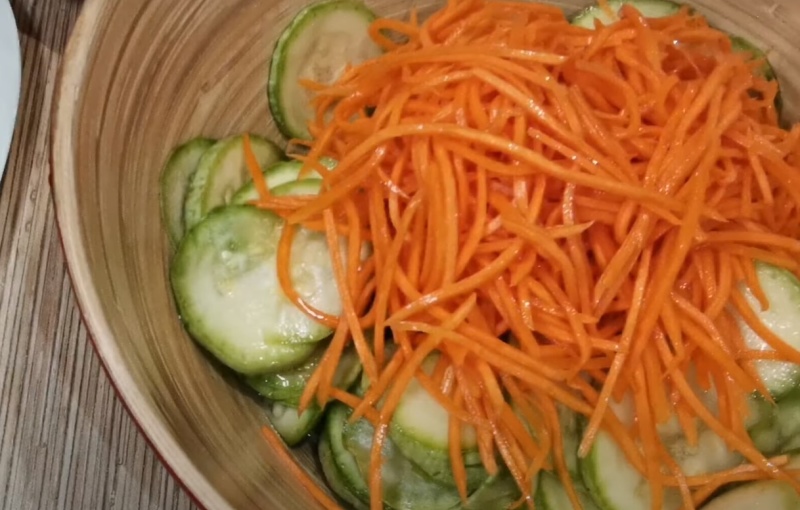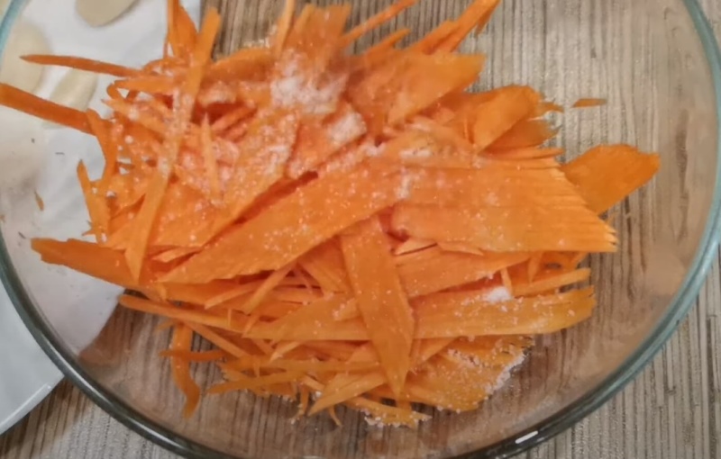 Wymieszaj i pozostaw na 30 minut. W tym czasie obierz marchewkę i pokrój w paski. Jeżeli posiadasz specjalną maszynkę do krojenia warzyw w paski – użyj jej, jeżeli nie – nóż też się sprawdzi. Marchew włóż do kolejnej miski, posyp szczyptą soli, wymieszaj i pozostaw na 30 minut.