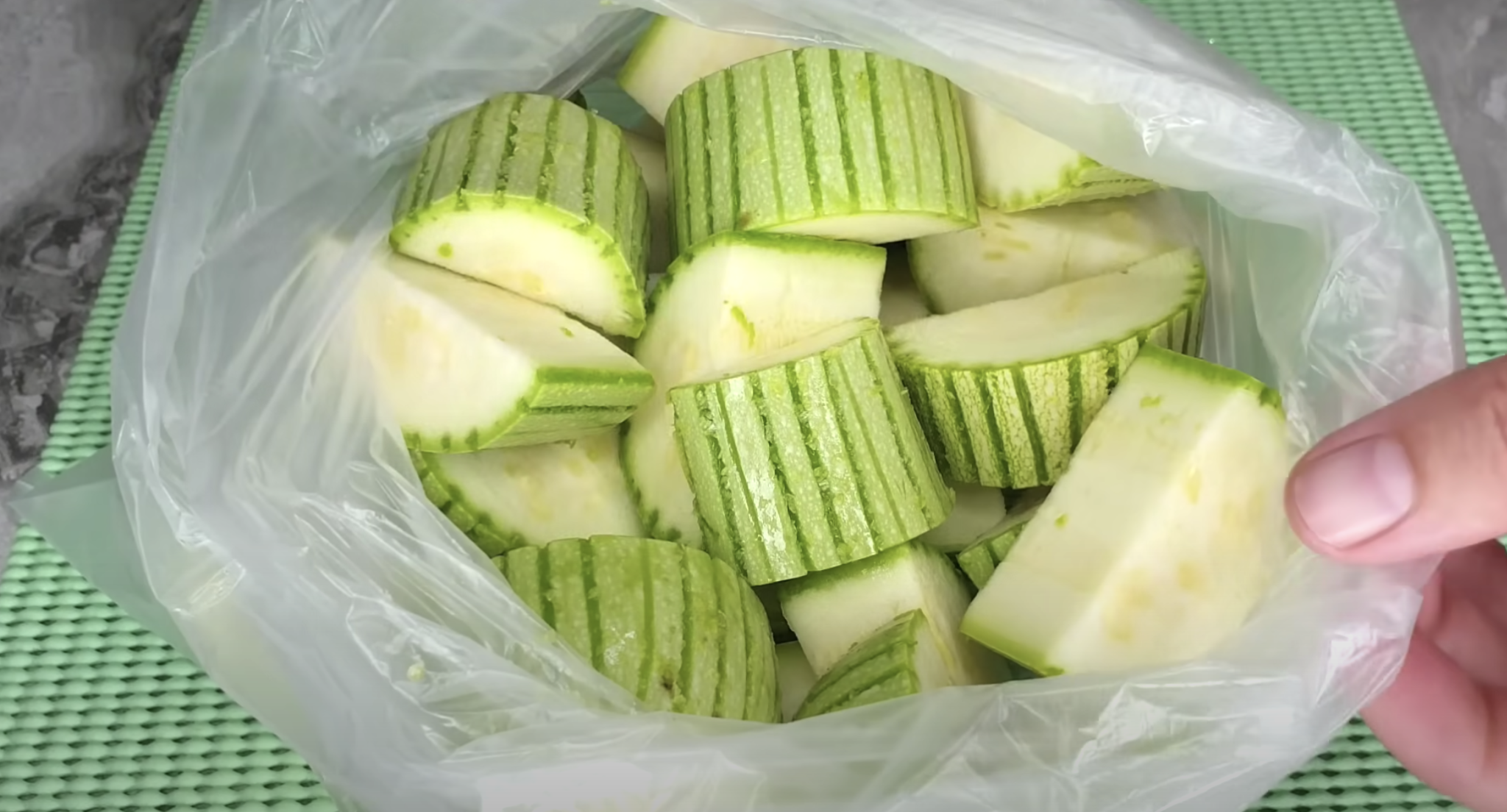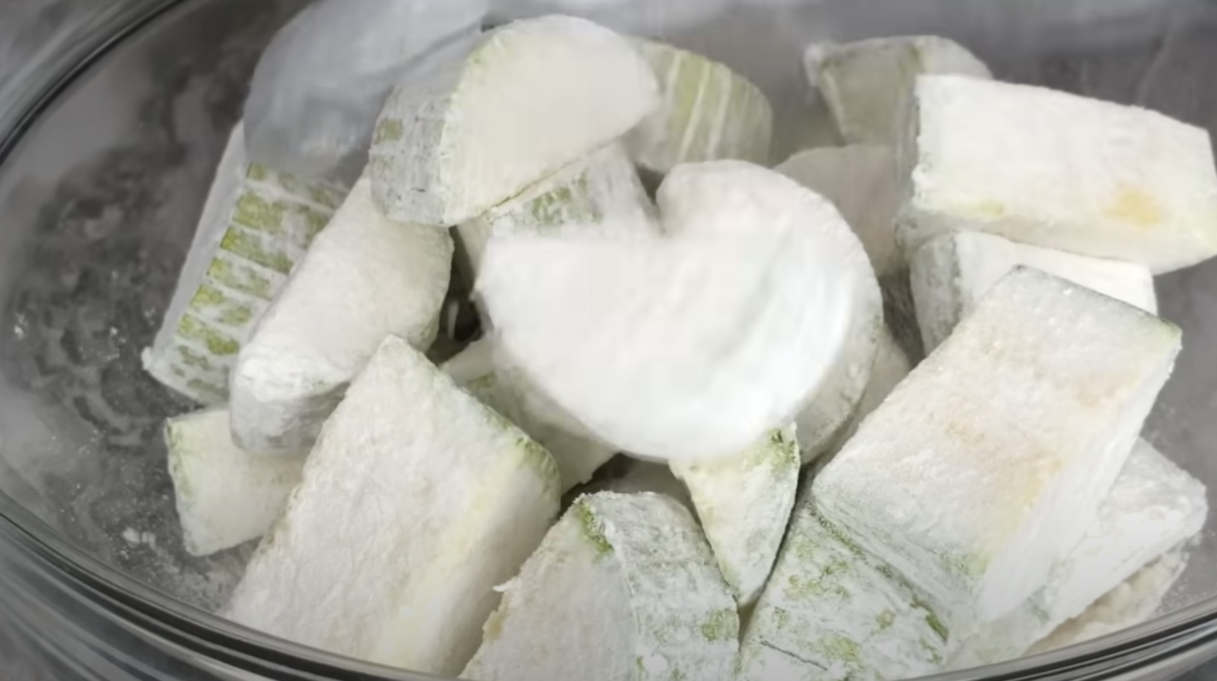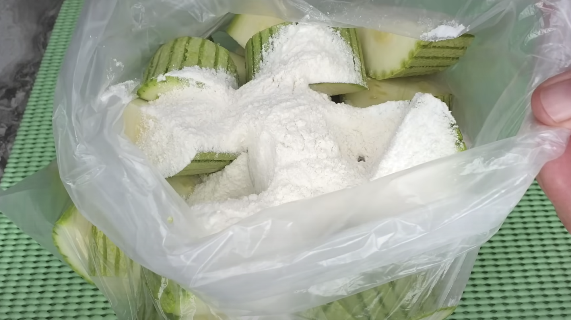 Pokrojoną cukinię umieść w woreczku. Dodaj skrobię kukurydzianą, mąkę i sól.