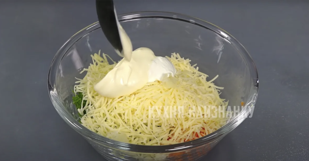 Cebulę pokrój w kostkę, czosnek przeciśnij przez praskę, koperek drobno posiekaj, marchewkę utrzyj na tarce o małych oczkach, zaś ser na grubych oczkach. Wszystkie składniki wymieszaj w misce z łyżką śmietany i majonezu. Dopraw solą. Możesz dodać do smaku odrobinę ulubionej musztardy.