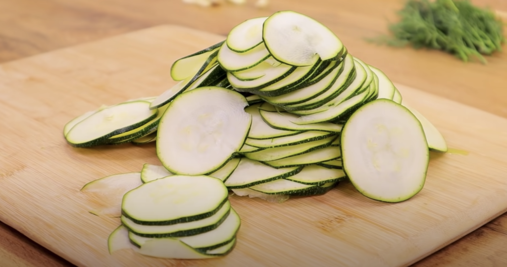 Dopraw solą i pieprzem, wymieszaj. Drugą cukinię pokrój w cienkie plasterki.