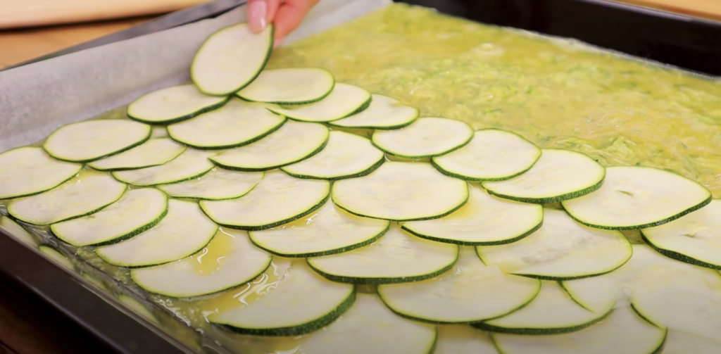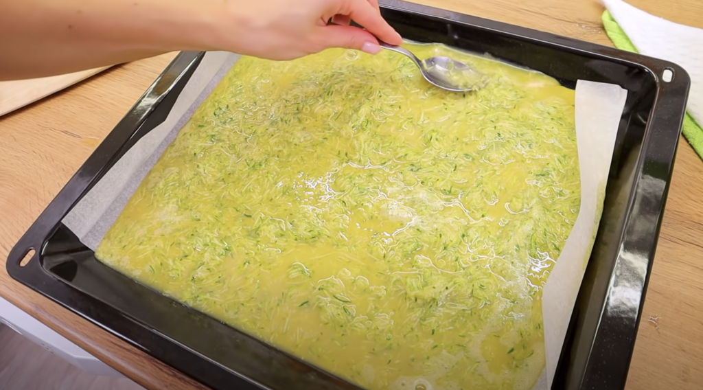 Ułóż mieszankę z cukinii i jajek na blaszce wyłożonej papierem do pieczenia.