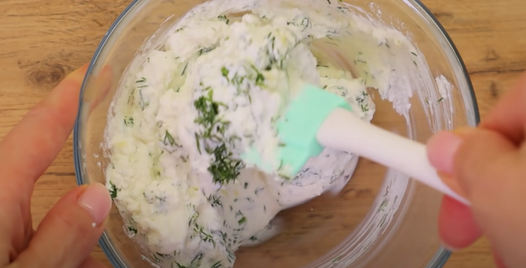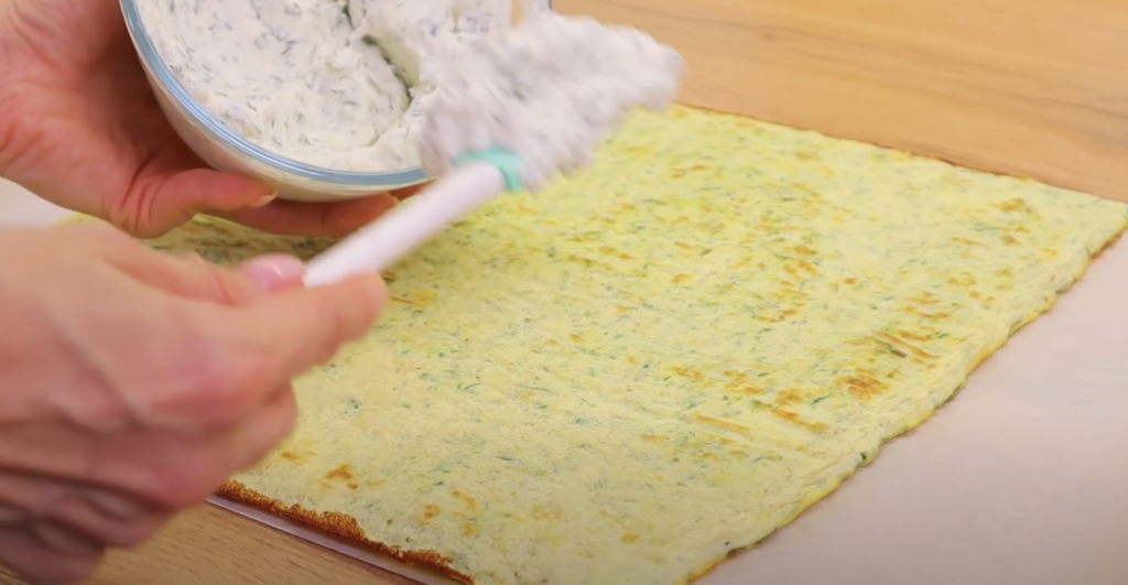 Ser wymieszaj z przeciśniętym przez praskę czosnkiem i posiekanym koperkiem, dopraw solą i pieprzem. Obróć upieczone ciasto tak, aby kawałki cukinii znalazły się na dnie. Posmaruj je serową mieszanką.