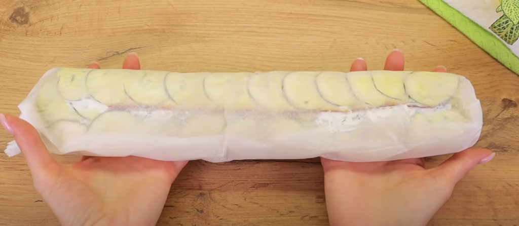 Za pomocą papieru do pieczenia zwiń ciasto w roladę.