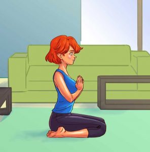 Jak to zrobić: Siedząc na kolanach starach się rozluźnić nogi i przyciągnąć tyłek do ziemi. Nogi utrzymuj na szerokości bioder. Ręce złóż przed sobą w pozycji modlitewnej. Rozciągaj plecy, szyję oraz otwieraj klatkę piersiową. Pilnuj głębokiego oddechu.