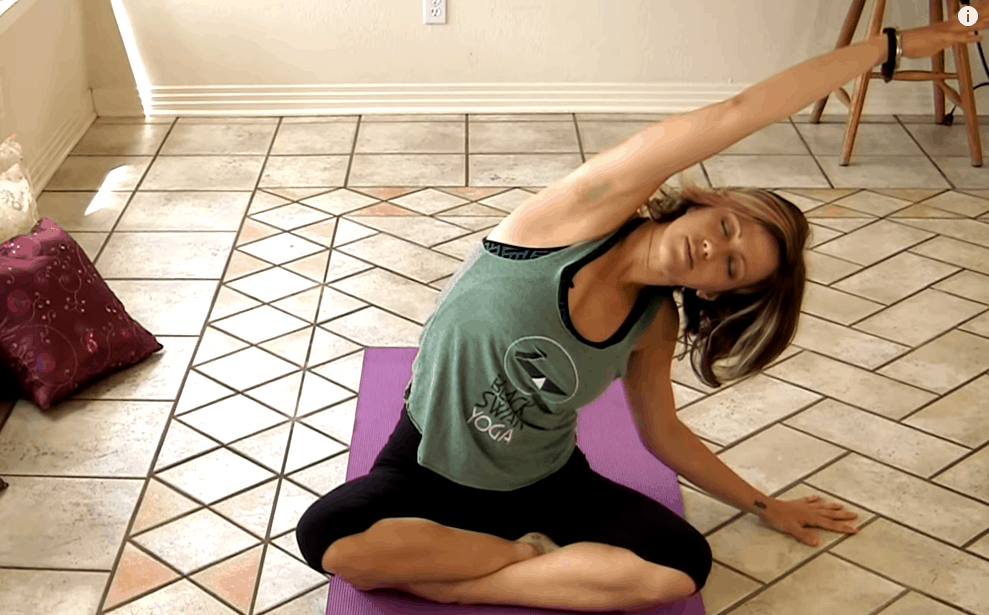 Siedząc po turecku połóż lewą dłoń na podłodze, prawą wyciągnij w górę i przeciągnij się na lewą stronę. Wyciągaj się tak długo aż poczujesz opór.