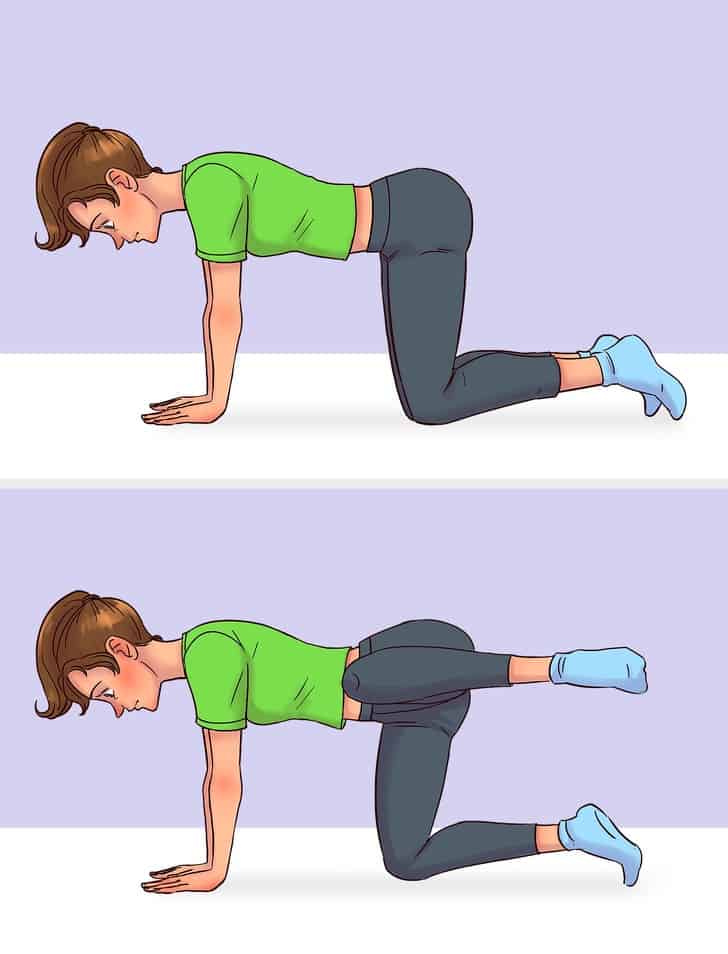 Dłonie powinny znajdować się na wysokości barków, a kolana tuż poniżej bioder. Plecy powinny być proste, a kolana zgięte. Lewą nogę przenosimy na bok mniej więcej na wysokości bioder. Wracamy do pozycji wyjściowej. Zmieniamy nogi i kontynuujemy ćwiczenie przez ok. 1 minutę.