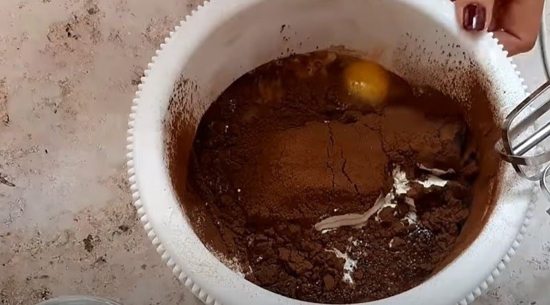 Zacznij od przesiania mąki i kakao do głębokiej miski, dodaj cukier, jajka i mleko.