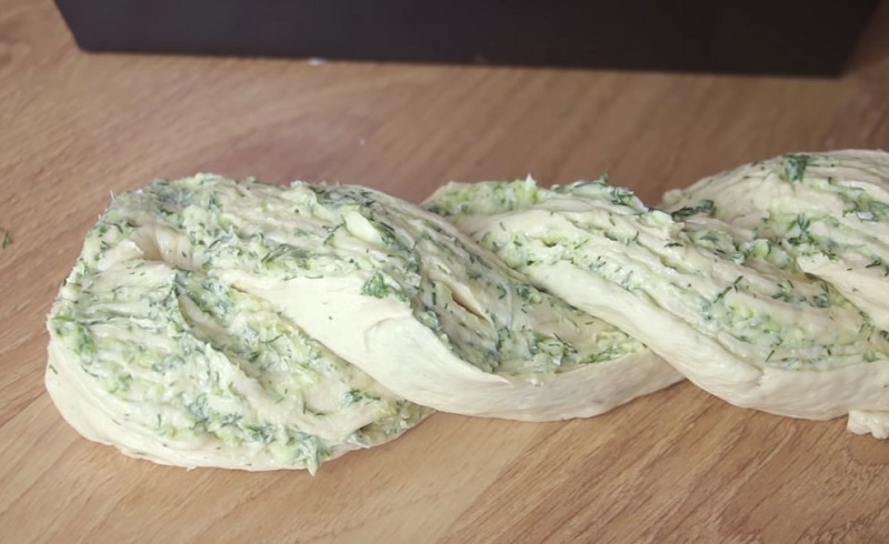 Kiedy minie już godzina, rozwałkować ciasto na cieńszą warstwę i posmarować je nadzieniem po całej powierzchni. Później zwinąć ciasto w rolkę i przeciąć je wzdłuż na 2 części, a następnie zapleść z niego tzw. „warkocz”.