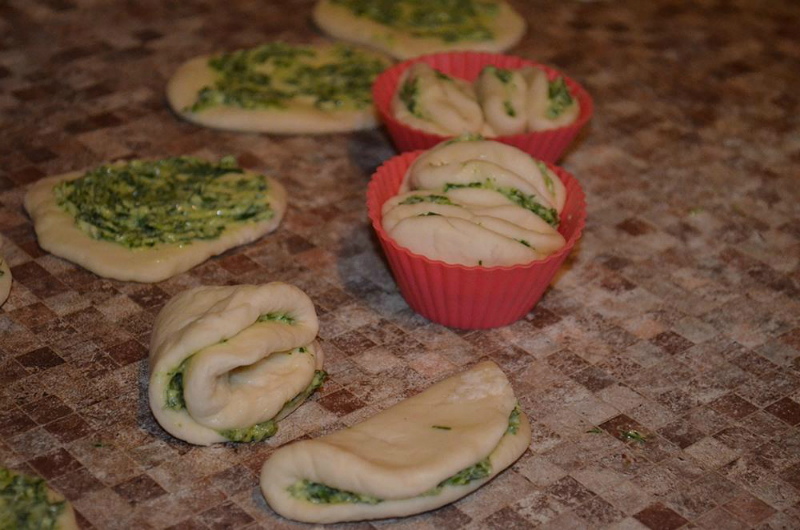 Plastry składamy go na pół i następnie ponownie poprzecznie na pół. Tak złożone ciasto z nadzieniem wkładamy do małych foremek do muffinek – po 2-3 sztuki do każdej. Na koniec ciasto smarujemy żółtkiem i pieczemy w 180 stopniach przez około 20-25 minut.
