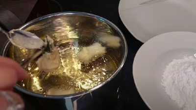 Na patelnię wlewamy około pół litra oleju, tyle powinno wystarczyć, aby pączki się w nim unosiły. Następnie przygotuj talerz z cukrem pudrem. Za pomocą dwóch łyżek nabierz ciasto i włóż do gorącego oleju. Pączki smażymy na złoty kolor ze wszystkich stron. Następnie natychmiast obtocz je w cukrze pudrze, gdy są jeszcze gorące.