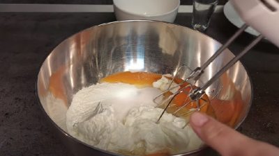 Mąkę przesyp do miski, dla zdrowszej wersji dobrze jest użyć mąki orkiszowej, ale możesz też użyć zwykłej. Dodać rum, jajka, cukier waniliowy, twaróg i proszek do pieczenia i zagnieść sztywne ciasto. Nie może być zbyt cienki, ale jednocześnie niezbyt sztywny, aby dobrze się z nim współpracowało.