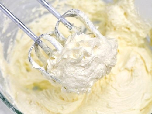 Mieszaj mieszankę trzepaczką, aż powstanie krem. Następnie dodaj esencję waniliową, zmiękczone masło. Mieszaj, aż masło się rozpuści.