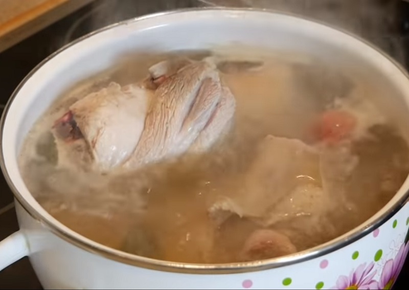 Następnie rozdzielić je na duże części dłońmi, oczyszczając z kości itd. Zetrzeć czosnek na drobnej tarce, dodać zmielony pieprz i wymieszać. Wziąć plastikową butelkę i odciąć jej górę. Wrzucić do butelki kawałki mięsa, naprzemiennie z czosnkiem. Wlać 200-250 ml wody pozostałej z gotowania mięsa przez sito.