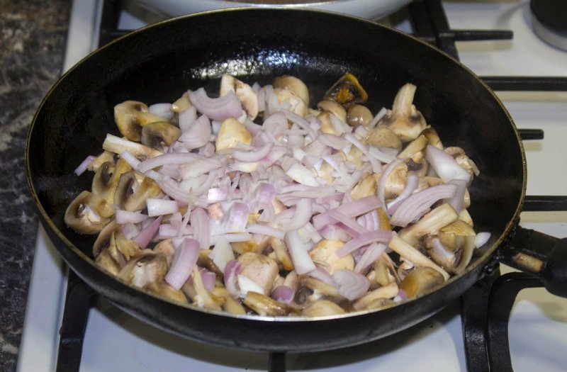 Rozpuść masło na patelni. Podsmaż pokrojoną cebulę w półpierścienie oraz grubo pokrojone pieczarki.