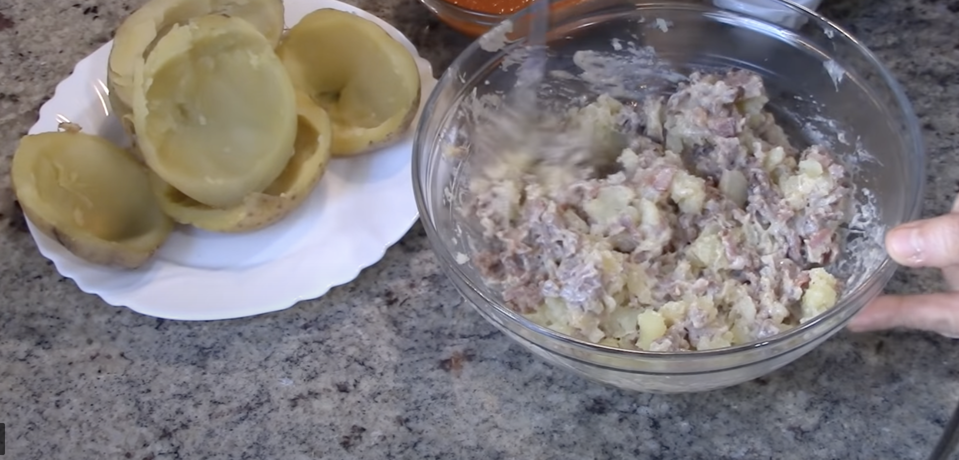Plastry boczku pokroić na mniejsze kawałki i dodać je do mięsa, po czym całość należy dusić. Kiedy ziemniaki będą już miękkie, trzeba je przekroić wzdłuż, a środek wydrążyć.