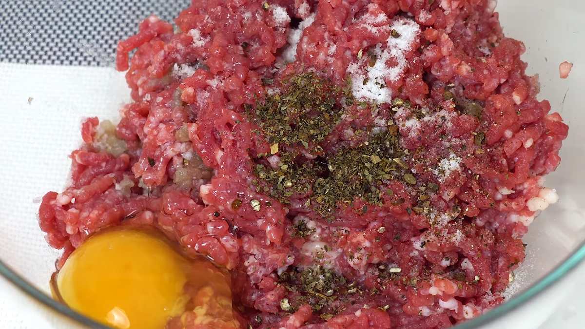 Obierz cebulę i czosnek. Cebulę zetrzyj na tarce o grubszych oczkach, a czosnek zetrzyj drobniutko lub przepuść przez praskę. Połącz cebulę i czosnek z mielonym mięsem i wymieszaj. Następnie dodaj jeszcze mąkę, jajko, olej słonecznikowy oraz przyprawy: paprykę, tymianek, posiekaną pietruszkę, pieprz oraz 1 łyżeczkę soli. Wszystko dokładnie wymieszaj ze sobą.