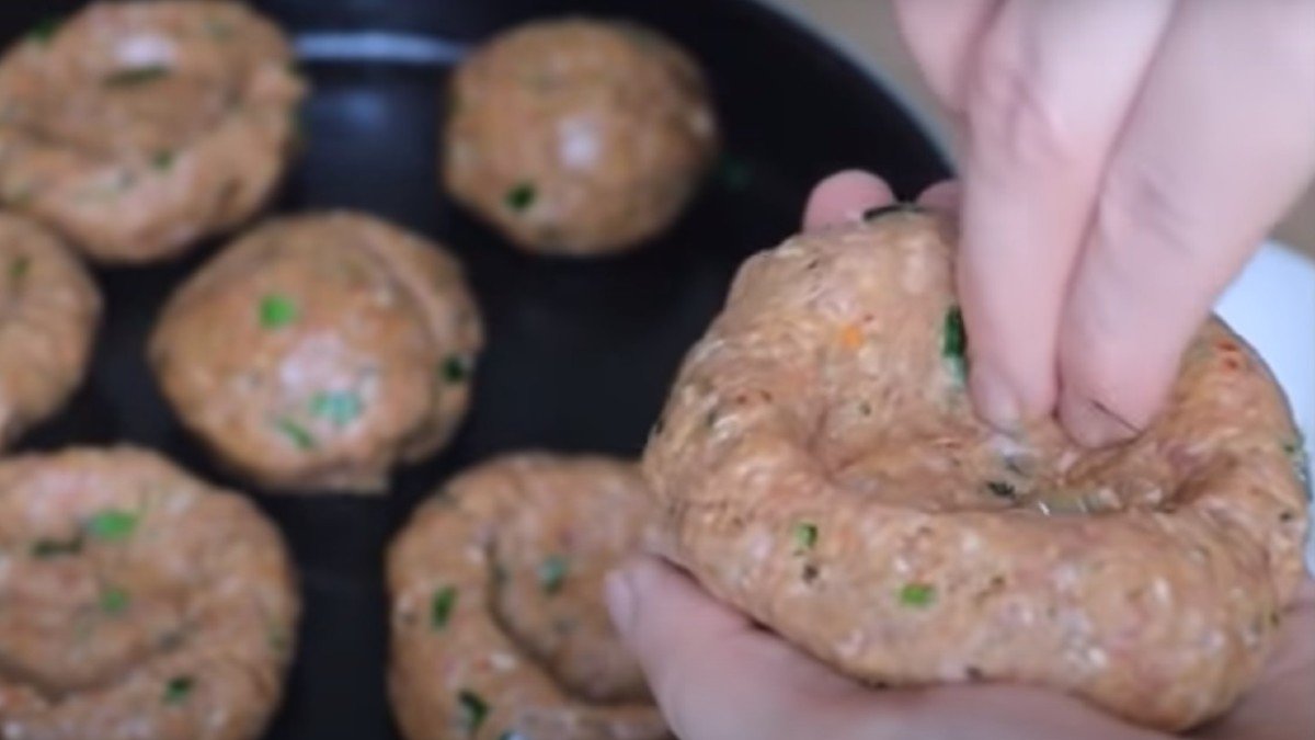 Posmaruj swoje ręce olejem roślinnym i po kawałku odrywaj masę mięsną. Każdy kawałek uformuj w kulkę i ułóż na blaszce do pieczenia. Na środku każdej kulki zrób rowek, tak aby powstało „gniazdko”.
