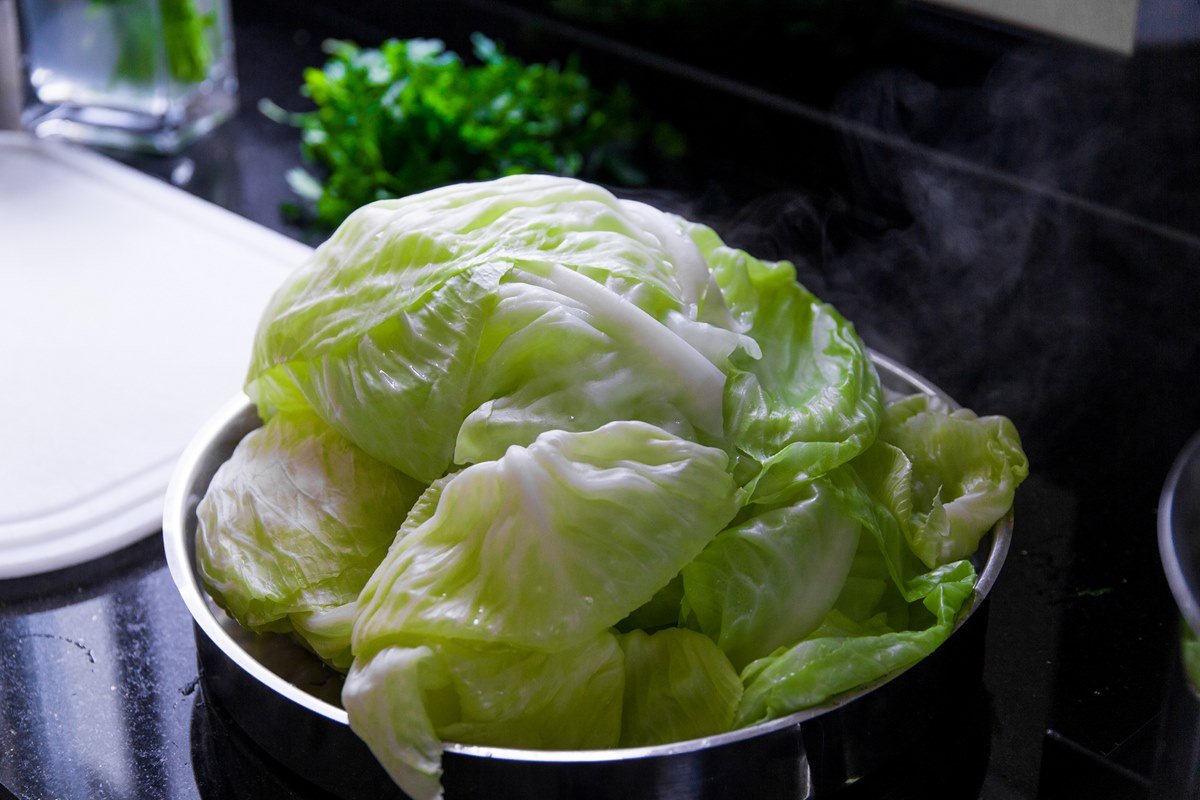 Umyj kapustę, usuń górne liście i odetnij łodygę. Włóż główkę kapusty do garnka z wrzącą wodą. Gdy liście staną się miękkie i elastyczne, wyciągnij je z garnka. Następnie pozwól im ostygnąć.