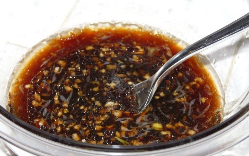 Czosnek posiekaj lub przeciśnij przez praskę, a następnie wymieszaj z przyprawami, cukrem, sosem sojowym oraz skrobią.