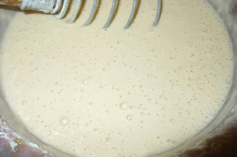 Połącz kefir i sodę w głębokim pojemniku. Po przejściu reakcji (zniknie piana) dodaj sól, cukier, olej roślinny i jajka. Ubij wszystko trzepaczką lub mikserem.